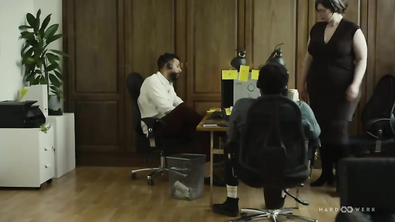 And she ends up enjoying two at once!! This sexy, chubby girl has been having a rough time sexually. Too many months without sex and she's going crazy. She desperately needs a good cock. And her two office buddies are going to lend her a hand with that...