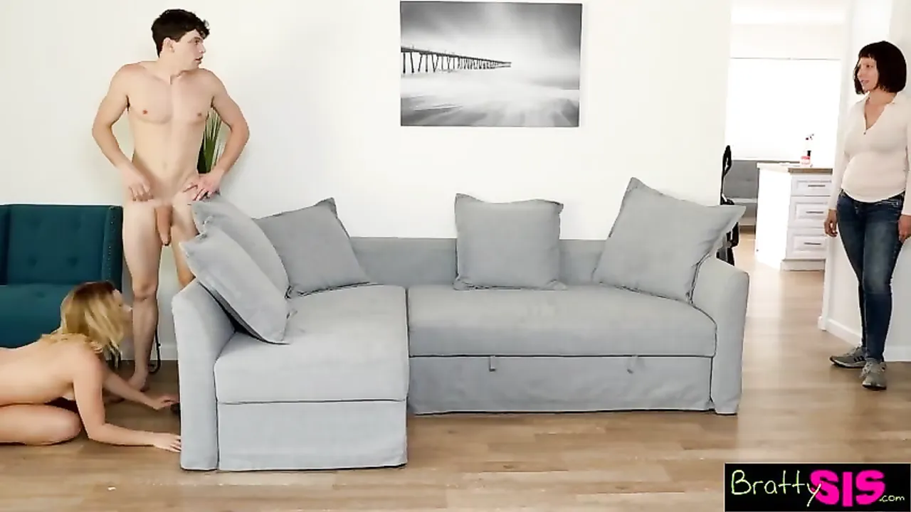 This college hottie has her boyfriend at home, and even though her mom's out doing chores, they start making out and groping each other like pigs. What a pussy-eating session and what a delicious secret fuck!