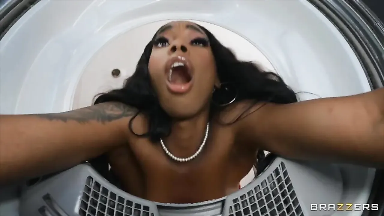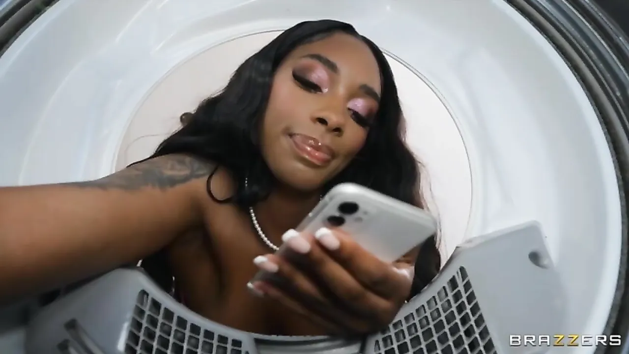 Deze geile, voluptueuze zwarte meid zit vast in de wasmachine en vraagt haar huisgenoot via WhatsApp om hulp. De situatie is absurd, maar zodra de man haar grote kont zo makkelijk te bereiken ziet, besluit hij zijn broek naar beneden te trekken en zijn piemel er genadeloos in te rammen...!!