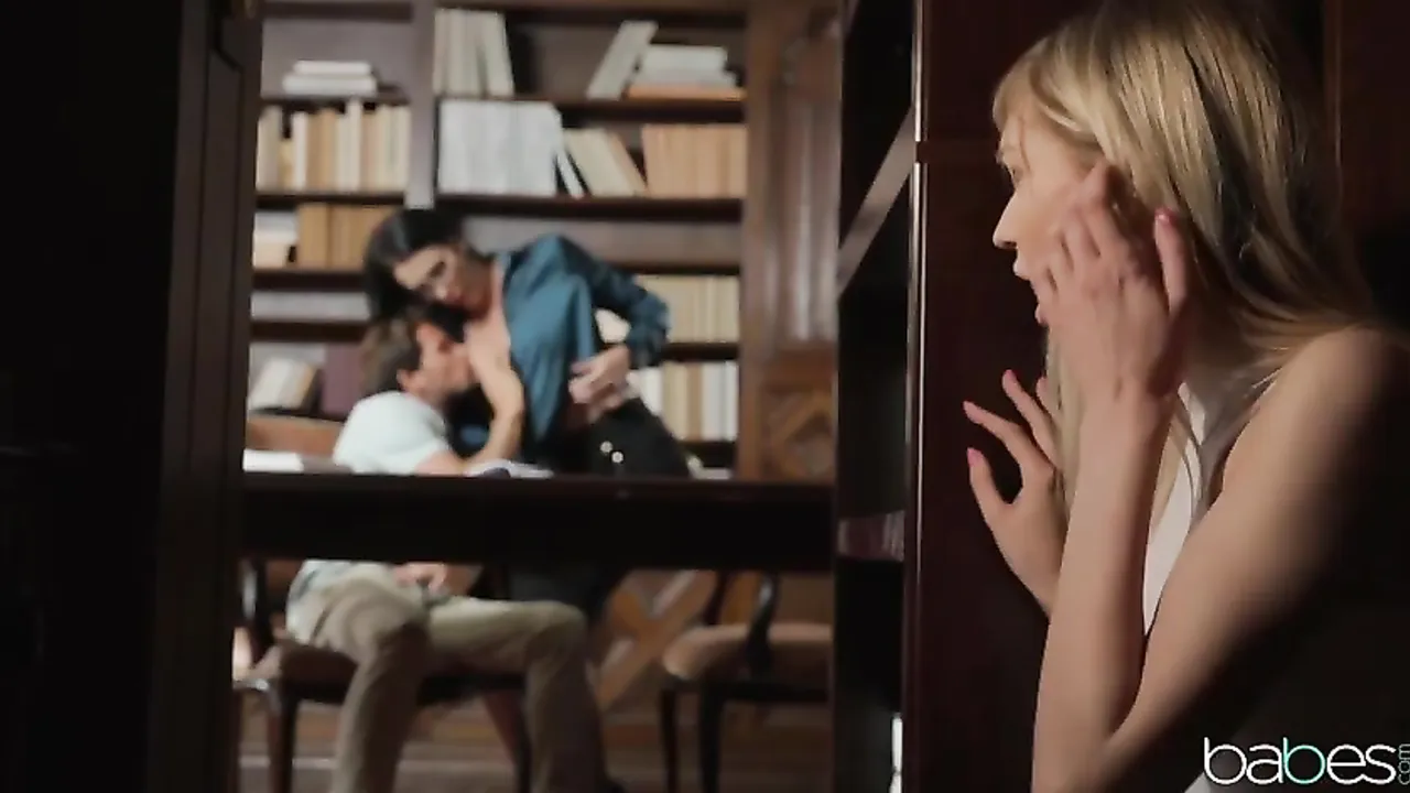 Esta chica mirona no puede creer el morbo de la situación de estar espiando a una pareja besándose y metiéndose mano en la biblioteca. Se muere de ganas porque le inviten a unirse a ellos y poder disfrutar de polla y coño a la vez!