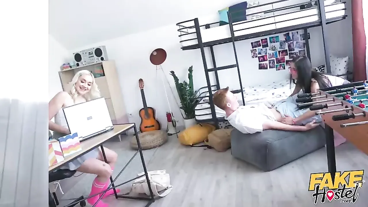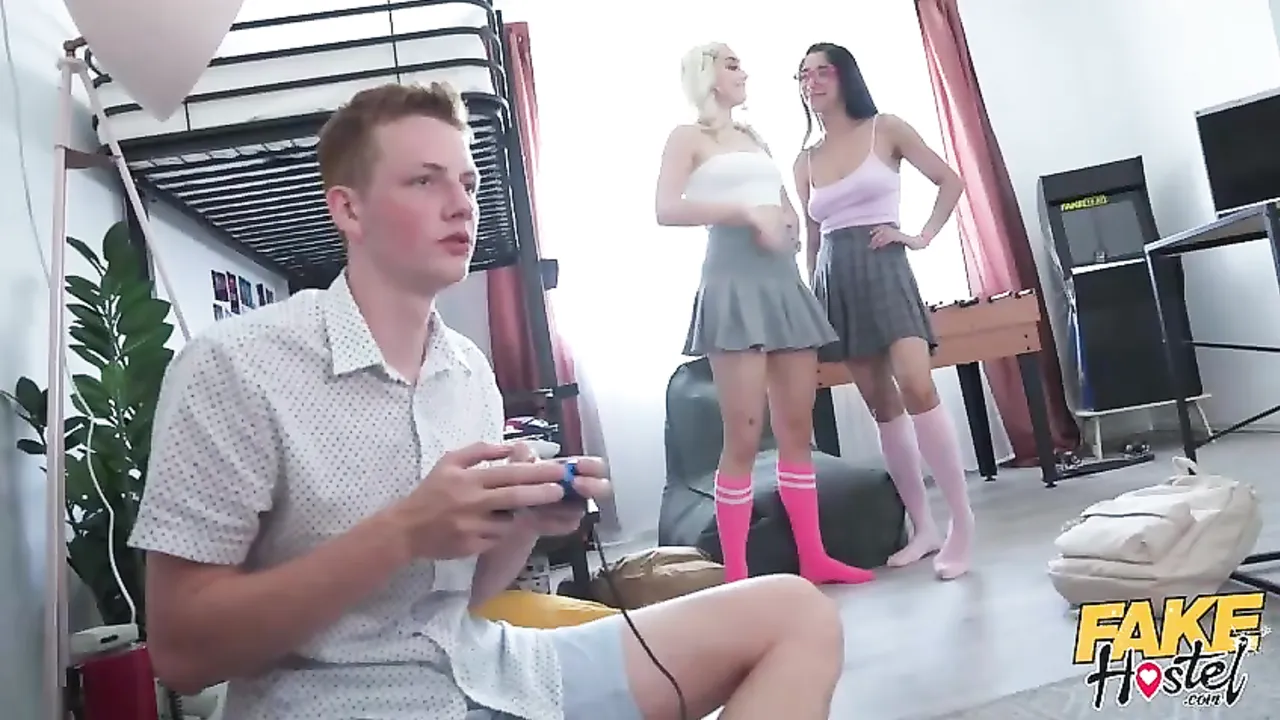 Estas dos zorritas no soportan el desplante de que su compañero de habitación esté enganchado a las maquinas y no las haga caso. Ellas quieren atención y quieren polla asi que se las apañan para calentarle y forzarle a que las folle bien folladas a las dos juntas!