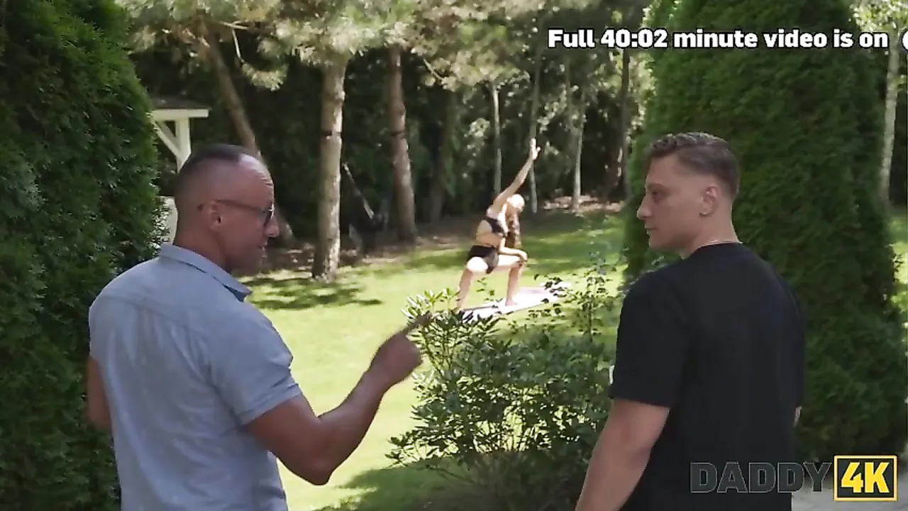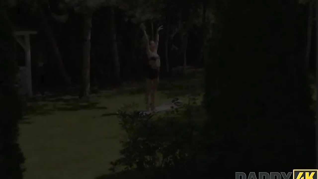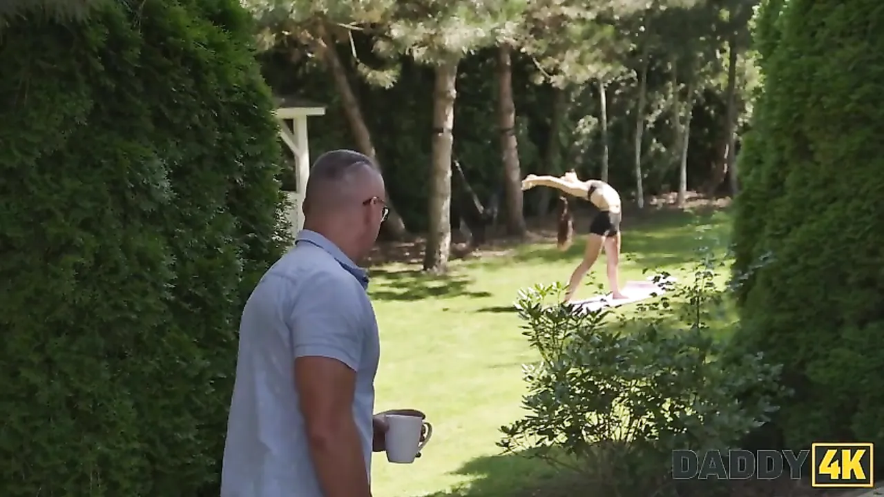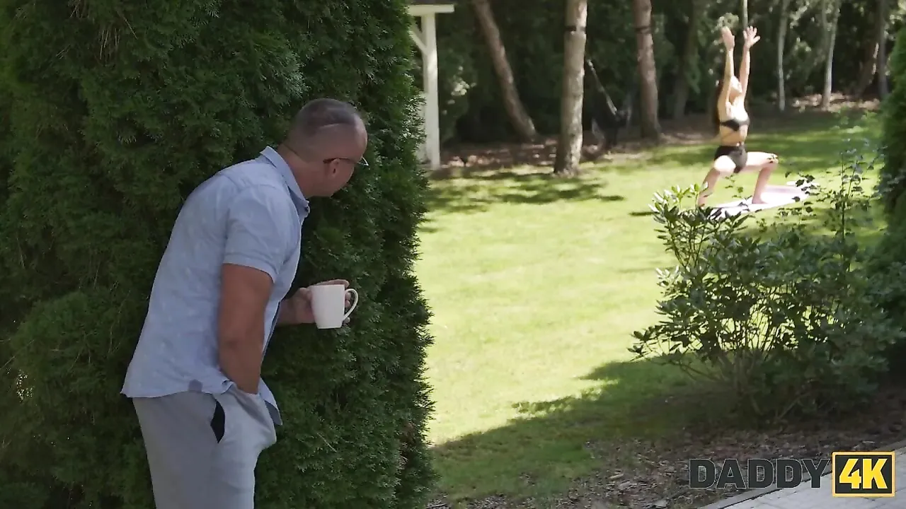 Den liderlige farfadern spionerar på sin sons flickvän som gör yoga i trädgården...!!